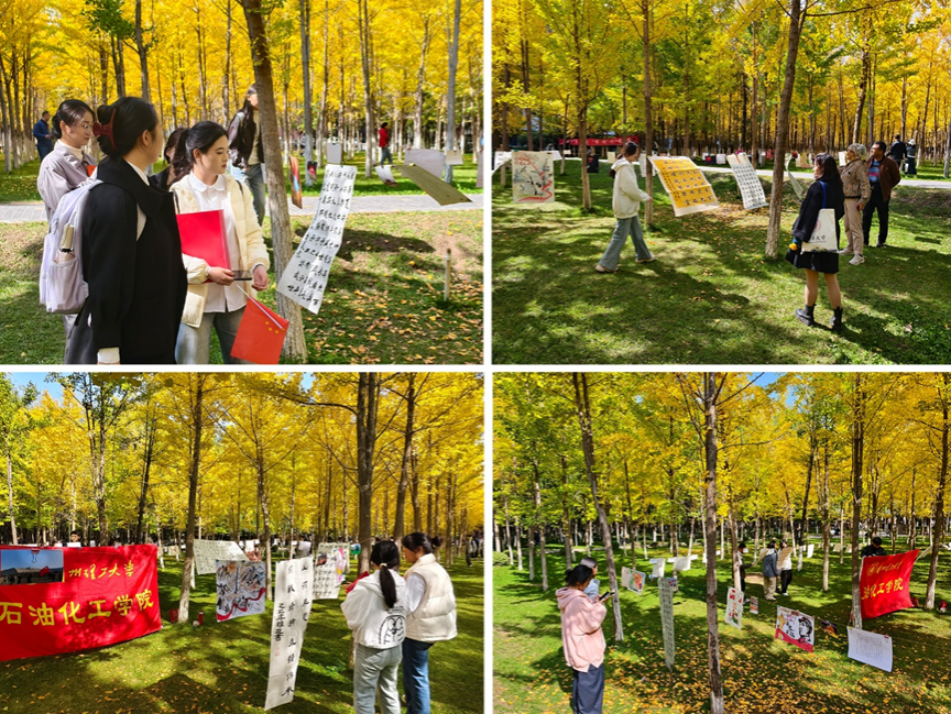 10月21日下午,石化学院团委在彭家坪校区银杏林启动“光影绘山河,翰墨颂丰碑”主题摄影、绘画、书法展,学生用原创佳作庆祝中华人民共和国成立76周年暨纪念抗战胜利80周年,吸引广大师生驻足观看。