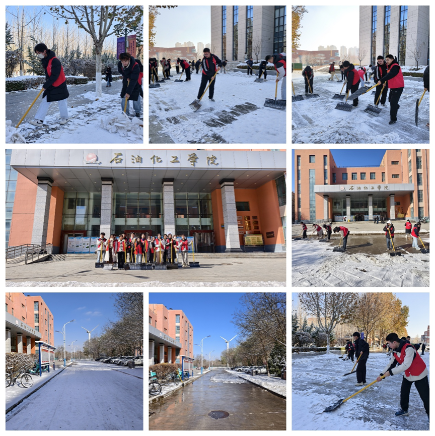 11月24日,兰州突降大雪,校园道路积雪湿滑。为保障师生出行安全,兰州理工大学石油化工学院第一时间组织青年志愿者开展扫雪除冰行动。