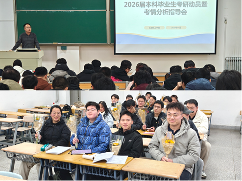 2026年全国硕士研究生招生考试进入最后冲刺阶段,石油化工学院始终心系考研学子,精心策划并开展了一系列形式多样的关怀活动,为备考学子保驾护航、加油鼓劲。学院在考研前期专门组织召开了考研动员会,帮助学子坚定备考信念、缓解心理压力;邀请经验丰富的教师为学子们开展了考情分析指导会,精准解读今年各专业考研最新动态、命题趋势,细致分享重难点突破方法与应试技巧,现场为学子们逐一解答复习过程中遇到的各类困惑。各班级也积极响应,纷纷开展师生深度交流、同学间加油打气、暖心祝福对话等互动活动,让备考路上的学子不再孤单,营造出互助共进、积极向上的浓厚备考氛围。