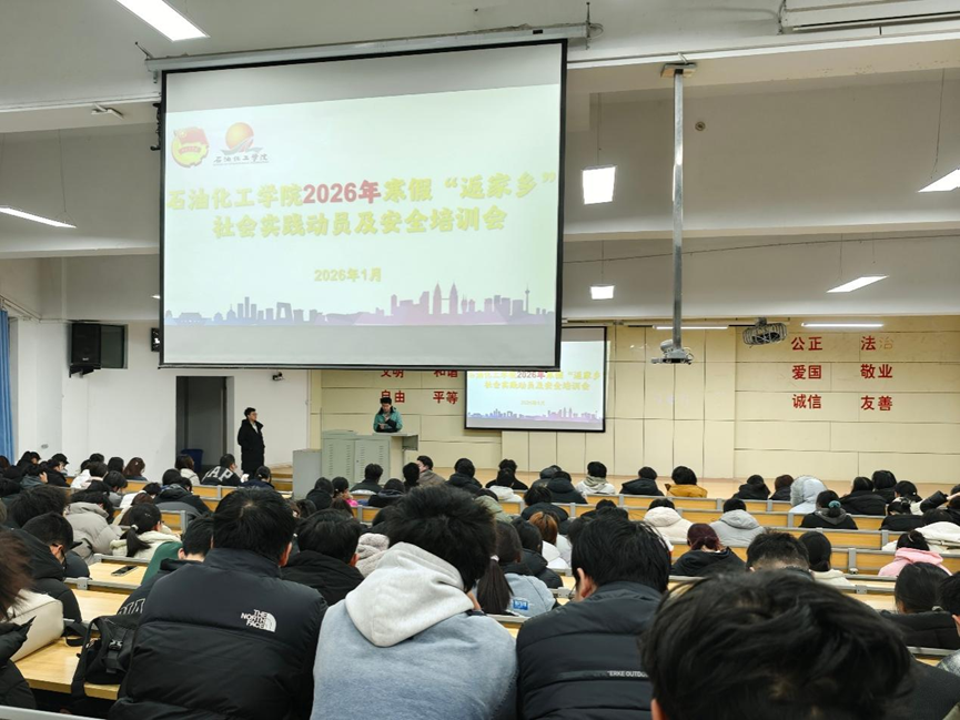 为深入学习宣传贯彻党的二十大和二十届历次全会精神,落实学校第四次党代会部署与学校第十四次团代会要求,积极响应全国大学生“青春为中国式现代化挺膺担当”“返家乡”社会实践号召,1月6日,石油化工学院团委在彭家坪校区召开2026年寒假社会实践动员暨安全培训会,学院“青马工程”培训班学员、实践团队成员及各年级学生代表参加会议。会议由学院团委老师朱柯宇主持。