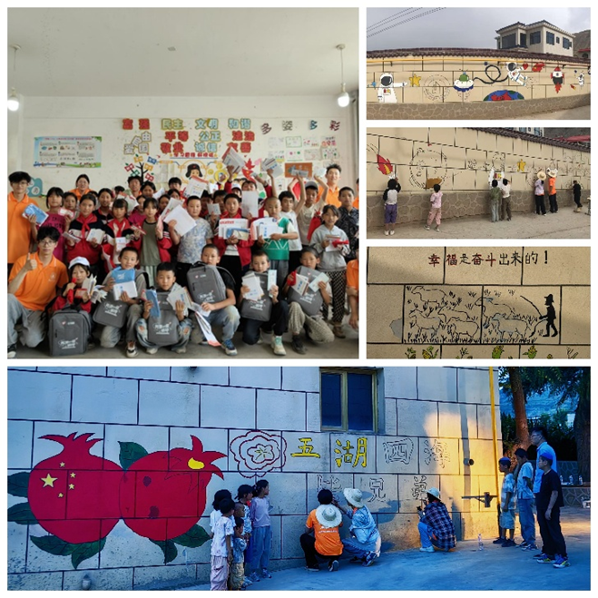 青春足迹遍陇原,多维宣讲广覆盖。暑期,宣讲团奔赴临夏州东乡族自治县果园镇李坪村,开展精神宣讲、核能科普、民族团结教育与“童心呵护”公益课堂。队员们与孩子们共同创作15米“两弹一星”主题墙绘,通过故事讲述、模型展示、动手实验等形式,将爱国精神与科学知识送到乡村一线。