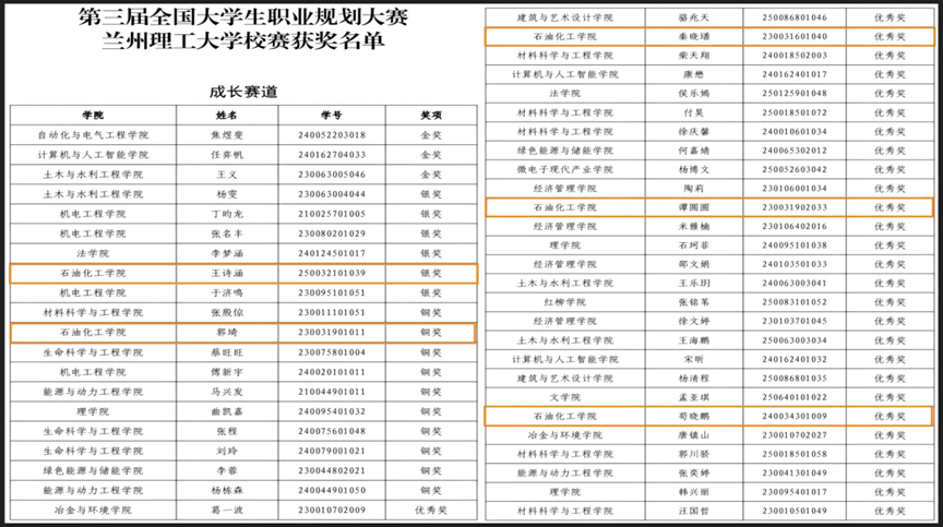 近日,第三届全国大学生职业规划大赛甘肃省赛圆满收官,石油化工学院师生凝心聚力、奋勇拼搏,在多个赛道取得优异成绩:2023级安全工程专业研究生赵雨荷荣获就业赛道银奖,2023级化学工程与工艺专业红柳卓越班本科生段学彤、许雅轩分获就业赛道铜奖,总计斩获省级奖项一银二铜。