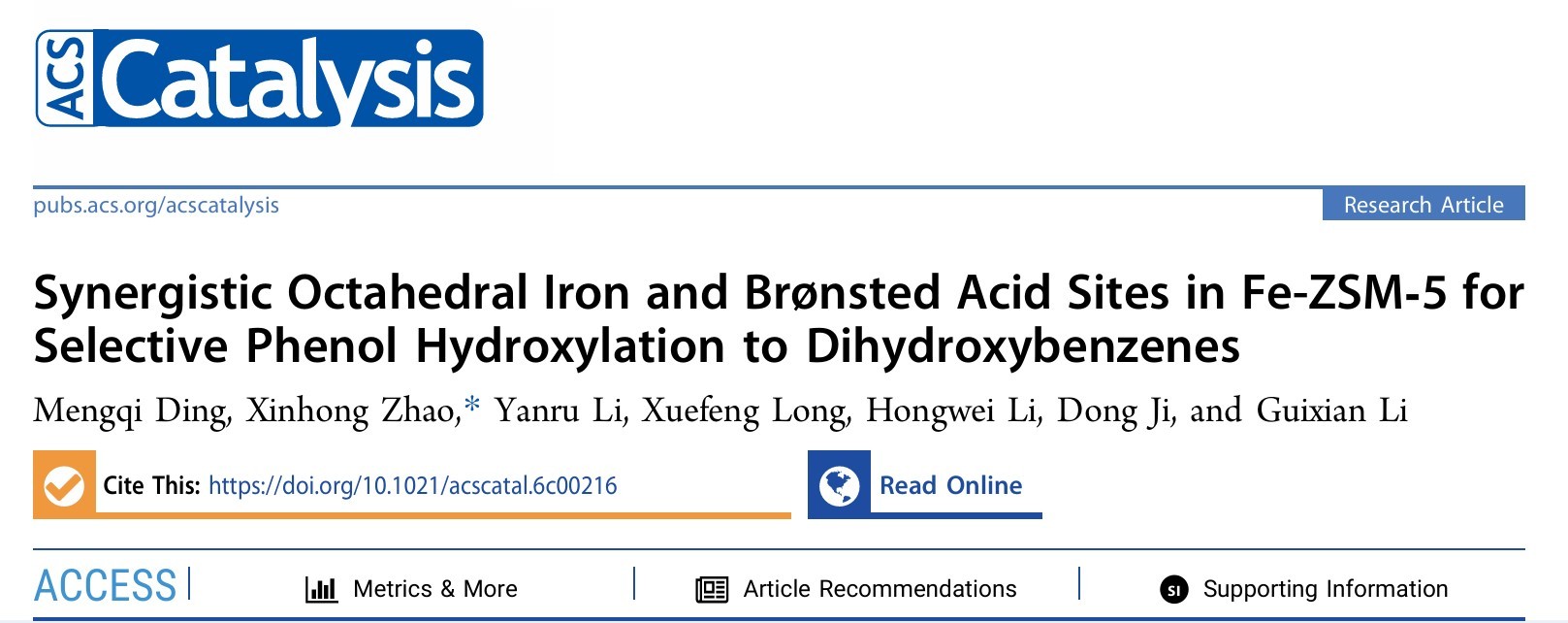 近日,我校石油化工学院赵新红教授课题组在国际催化领域顶级期刊《ACS Catalysis》(JCR:Q1;影响因子:13.084)上发表题为“Synergistic Octahedral Iron and Brønsted Acid Sites in Fe-ZSM-5 for Selective Phenol Hydroxylation to Dihydroxybenzenes”的论文,论文链接:https://doi.org/10.1021/acscatal.6c00216。