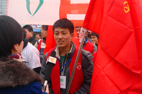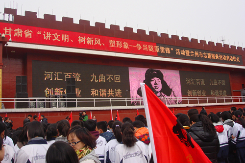 启动仪式在“学习雷锋,好榜样,忠于革命忠于党…”的歌声中开始。数千人齐唱的“雷锋之歌”响彻东方红广场;雷锋同志生前战友姜文志以及兰州市志愿者代表梁海龙分别作了发言,并发出《弘扬雷锋精神开展志愿服务》的倡议。与会的省、市领导向兰州市志愿者组织代表授旗,同时,兰州“好人墙”也正式揭幕。我院青年志愿者代表马永博同学参加了授旗仪式,并接受了兰州电视台记者采访。