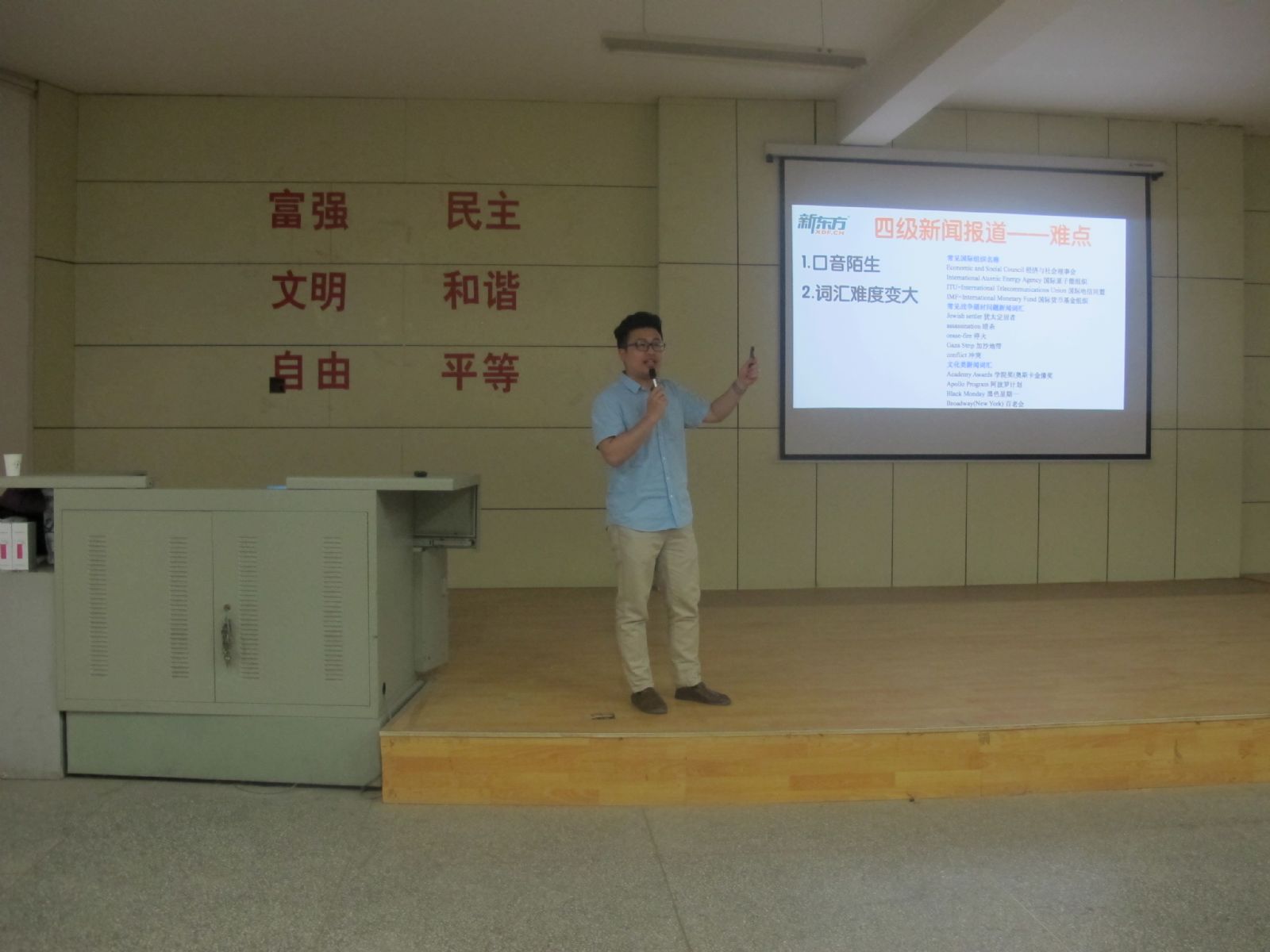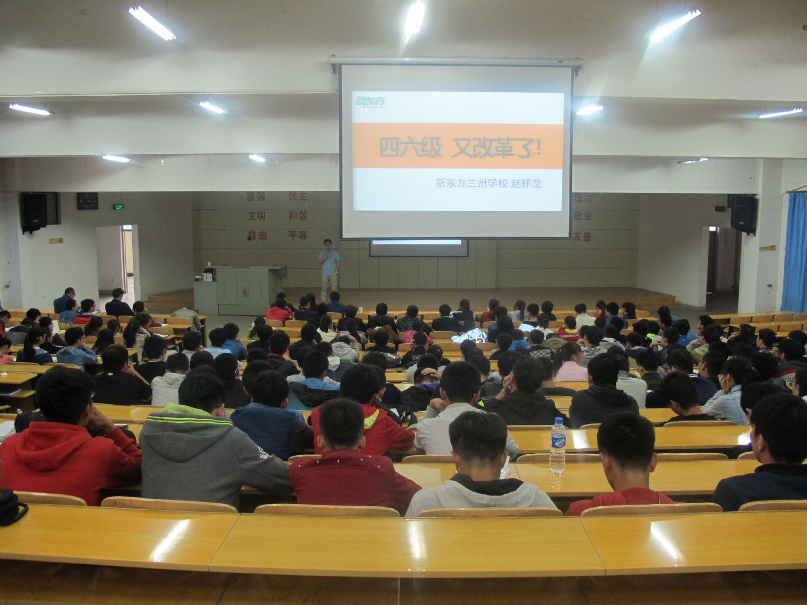 为帮助同学们从容应对四级考试的新变化,提高同学们的四级通过率,增强同学们就业的整体竞争力,石化学院于4月5日下午15:00在西教2-108教室特邀新东方兰州英语学校专门从事英语四六级辅导的赵祥龙等三位老师为石化学子做了英语四级题型和应试技巧讲座,学院党委李荣华副书记、全体辅导员以及300余名今年6月份将参加英语四级考试的学生参加了本次讲座。讲座由学院团委书记骆焕涛老师主持。