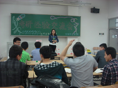 2012年5月24日晚,石油化工学院在西校区2号楼201教室举办了考研经验交流会。据统计,今年石化学院08级考研成功人数为75人,读研率达到12.42%。2012年考取大连理工大学、华东理工大学、华南理工大学等重点大学的6名同学与准备考研的09级同学分享了他们的成功经验。