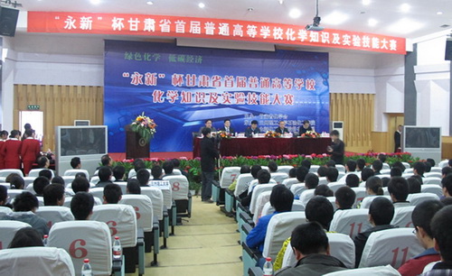 2011年11月26日, “永新”杯甘肃省首届普通高等学校化学知识及实验技能大赛在逸夫科技馆举行。学校俞树荣副校长,甘肃省化学会副理事长、西北师范大学化学化工学院雷自强院长,西北永新化工股份有限公司李华明副总经理、甘肃省化学会秘书长、中科院兰州化物所周峰研究员、甘肃省化学会副秘书长、中科院兰州化物所杨立明研究员,兰州大学、西北师范大学、兰州交通大学、西北民族大学、甘肃农业大学、兰州城市学院、甘肃联合大学等高校相关学院领导,学校教务处丁雨田处长、校团委张君书记、实验管理处徐惠副处长、学生处李竹梅副处长,石化学院所有院领导出席本次大赛,开幕式由石油化工学院杨保平院长主持。