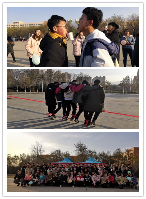 活动开始,工作人员将学生干部按照部门分为三组。首先进行的是暖场活动“报团打天下”,同学们围成一圈按照裁判的口令抱成一团,被淘汰的同学表演节目,场上的气氛很快热闹起来。紧接着“瞎子背瘸子踩气球”和“背夹气球”的游戏火热进行,同学们默契配合,积极参与,场地上洋溢着欢声笑语。天气虽冷,但热情不减。第一轮活动过后,“衔纸杯传水”和“坐地起身”的游戏在欢笑声中展开,短短五分钟内各个部门的比赛队员通过相互配合,将首位同学杯中的水依次传到收集桶内,容器中水最多的队伍获胜。活动接近尾声,学院学生干部相处越来越融洽,“六人五足”的游戏最考验默契,比赛在阵阵响亮的口号声里激烈进行。比赛结束后,所有到场人员合影留念,为本次活动画上圆满的句号。