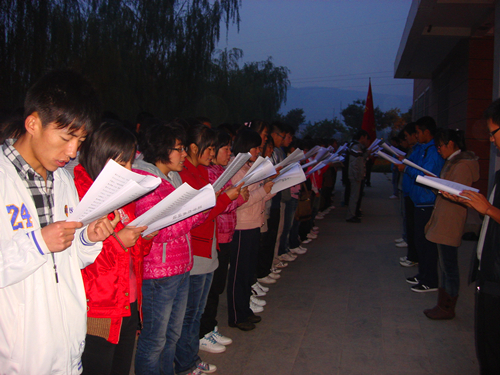 冬日七点钟的清晨,天色还朦朦胧胧,石油化工学院学子们已经聚集在工程训练中心前的小广场上开始了一天的国学经典诵读。虽然天气渐渐变冷,但同学们依然不畏寒冷,沐浴着晨光诵读国学经典,成为这个冬日里兰州理工大学校园中的一道亮丽风景线。