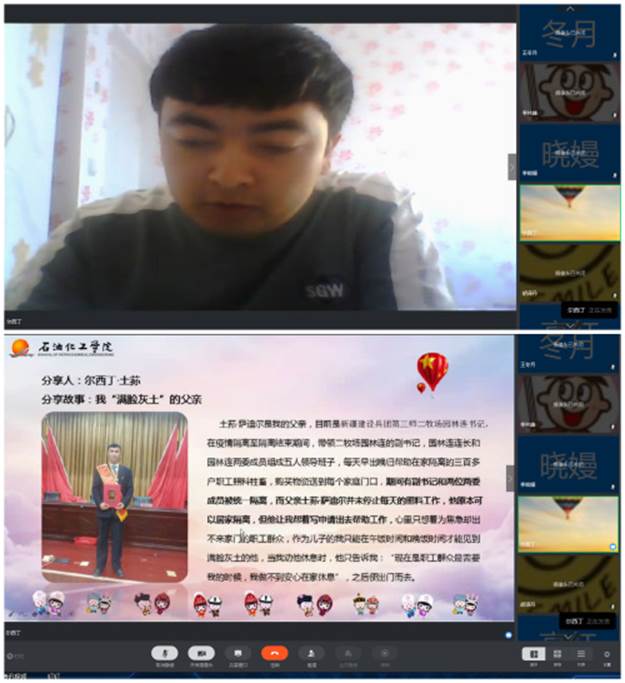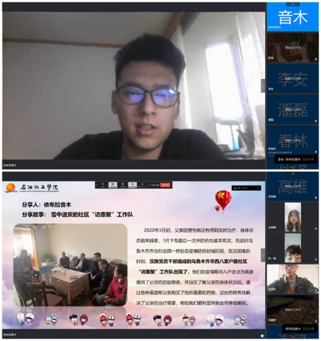 依布拉音木·阿不都热依木讲述了疫情期间,全家人无法外出去医院或药房购买稳定父亲病情的必须药物,汉族党员干部组成的乌鲁木齐市西八家户路社区“访惠聚”工作队入户走访,通过各种渠道帮父亲购买了所需药物,有效解决治疗需要帮助全家坚持到全市降级解封的故事。尔西丁·土荪分享了疫情防控期间,身为新疆生产建设兵团第三师二牧场园林连书记的父亲土荪·萨迪尔每天早出晚归帮助在家隔离的三百多户各族职工照料牲畜并购买物资送到每个家庭门口;大姐布阿吉·土荪主动申请从第三师二牧场医院检验科调去疾控中心上班,经常半夜外出及时检测内地归来汉族同胞体温并做好相关记录;二姐孜丽比娅·土荪在主动建立一连成员微信群,了解群众需求并汇报场部及时购买,忙碌两个月没能回家的故事。艾皮尔丁·赛买提则讲述了自己了解到的哈密市百万聚市场管理服务有限公司董事长在短短三天内召集商户、带领员工加班加点打出2.3万个“爱心馕”捐赠给哈密铁路公安处、市公安局特警支队、网格化巡逻大队等干部的感人故事。