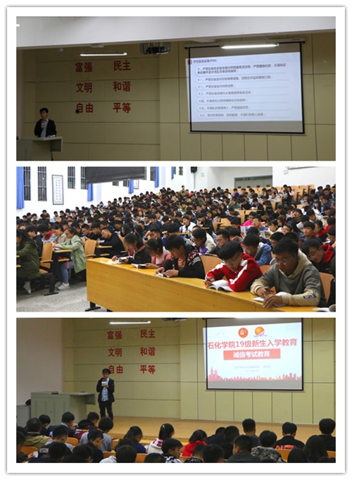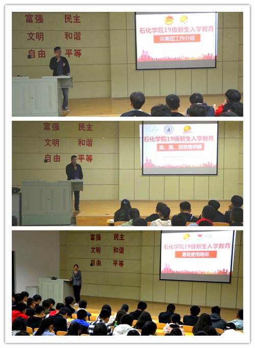 10月份,石化学院在彭家坪校区集贤楼108教室有针对性地开展了新生入学系列教育,由团委书记强龙、学院负责学生资助工作李玉鹏老师、学院易班工作站指导老师常婕、19级辅导员朱柯宇分别从班团建设、奖助贷政策、争当优秀、易班使用及网络安全教育和学生手册及诚信考试教育等多个方面为19级新生进行介绍和解读,帮助新生快速融入、早定目标,更快适应大学生活。