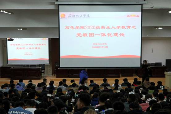 为全面贯彻落实党的教育方针,紧密围绕立德树人根本任务,做好学生思想政治工作,石化学院于11月11日晚开展2020级新生入学教育之党班团一体化建设大会,会议由张尚武老师主讲,全体2020级新生参加大会。