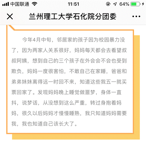 为进一步推动学院心理健康教育工作,普及心理健康教育理念,帮助学院同学关注自身心灵健康和心理成长,树立自尊自信、阳光向上的积极心态。石油化工学院于“5·25”心理健康月期间通过学院团委官方微信平台开展了以“有一个瞬间,让我觉得突然长大了”为主题的话题征集活动。