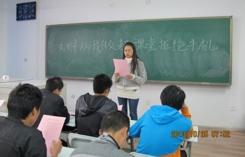 在教学楼前、教室和宿舍里,石化学院学生干部给全校同学发放了活动倡议书,学院辅导员老师为同学们讲解倡议书内容,指出在课堂上玩手机的众多负面影响。学生会干部则向同学们宣读“文明从我做起,课堂拒绝手机”倡议书的每个注意事项,倡议同学们上课期间不带手机,认真听课,为广大同学提供一个良好的学习环境,尊重授课老师,保证课堂上老师授课和学生听课的质量。同时,学院学生干部要以身作则,做出表率,积极对其他同学进行监督和劝导工作。