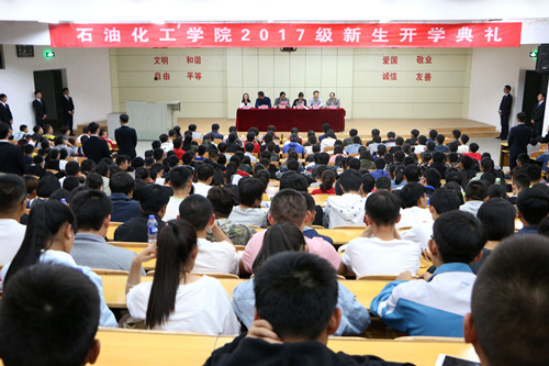 9月29日晚7点半,石油化工学院2017级新生开学典礼在2号楼108教室隆重举行。石化学院院长杨保平,党委书记隽惠玲,副院长梁瑞、张伟政、梁卫东出席了开学典礼,参加开学典礼的还有班主任代表、全体辅导员以及2017级全体新生。开学典礼由学院党委副书记李荣华主持。