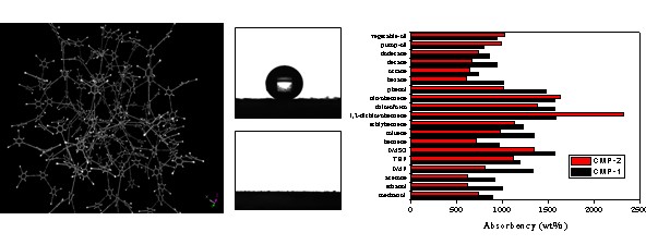 微孔共轭聚合物由于其具有纳米孔径、较大比面积以及良好的热稳定性和化学稳定性,该类材料在物理储氢材料方面显示出良好的应用前景。然而,其作为液体吸附材料鲜有报导。该工作首次报导了基于苯乙炔类微孔共轭聚合物的表面超疏水性,结合材料本身的微孔结构以及较大的比表面积,这类材料对水体中的油类、非极性溶剂表现出优异的选择性吸附、快速的动力学吸附性能和良好的重复使用性能。而且由于其良好的化学稳定性,该类材料对不同种类的极性溶剂也具有良好的吸附性能。此外,通过简单的手段,掺杂超疏水的微孔共轭聚合物到多孔材料(如海绵等)就可以制备疏水性吸附材料,这使得该类材料在大规模的水处理、液-液分离等方面具有良好的应用前景。
