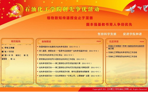 在石油化工学院网站上飘着一面鲜红的党旗,上面标有“石油化工学院创先争优活动专题”,点击党旗随即进入创先争优网页,进入后石油化工学院创先争优网页的口号映入眼帘:“格物致知传道授业止于至善,固本强基教书育人创先争优”。网站以教书育人为主题,创先争优为目标,激励着党员同志们积极参与到创先争优活动中来。网页分为四个部分:组织机构,新闻报道,先进典型和活动方案。大家可以直接点击标题进入自己想关注的信息。每个信息都图文并茂的展示了学校以及石油化工学院在创先争优活动中的一点一滴。让浏览网页的人更加丰富的了解创先争优活动的实施进展。