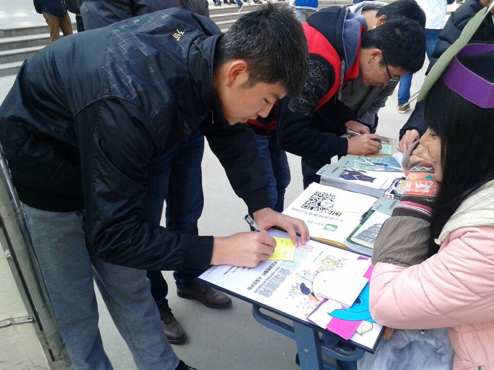 本次活动主要以海报展示、横幅签名、爱心留言、播放视频等形式展开。志愿者们通过制作动物头饰,头戴动物头饰,跳“兔子舞”等具体活动方式吸引广大师生关注本次活动。活动中,很多师生认真的听取志愿者们为他们详细讲解活动的内容和目的。在活动现场,师生留言、合影留念、联名签署等活动都有条不紊的进行,参与活动的广大师生纷纷表示愿意为保护这些可爱的动物尽一份可尽之力,今后都将用自己的行动来表明“拒绝动物表演,终止动物虐待”的决心!