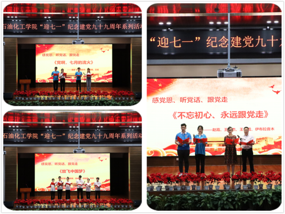 第二阶段开展“感党恩、听党话、跟党走”诗歌朗诵,师生党员代表或慷慨激昂、或婉转深情诵读《党啊,七月的流火》、《不忘初心、永远跟党走》、《放飞中国梦》等诗歌,引起了全体党员的强烈共鸣,更激发了躬身笃行的干劲和决心,全体党员以赤诚之心向党99岁生日献礼。