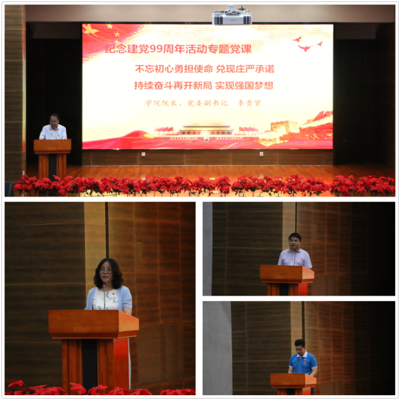 学院院长、党委副书记李贵贤同志给全体党员上了一堂题为《不忘初心勇担使命、兑现庄严承诺 接续奋斗再开新局、实现强国梦想》为主题的专题党课,从回首中国共产党99年来的风雨历程,充分展现了中国共产党为中华民族和中国人民立下的丰功伟绩。从党的十八大以来,以习近平同志为核心的党中央,高举中国特色社会主义伟大旗帜,不忘初心,牢记使命,带领全国各族人民决战脱贫攻坚,决胜全面小康,为实现中华民族伟大复兴的中国梦不懈努力,赢得了全党全国人民的衷心拥护和国际社会的普遍赞誉。从今年全国上下团结一心抗击新冠肺炎疫情,我们深深体会到中国共产党的坚强领导我们必须始终毫不动摇地坚定信念听党话,跟党走。最后结合学校百年发展和学院的实际,对全院师生党员提出希望和要求,要求全体党员立足岗位,勇于担当,秉承红柳精神,不忘入党初心,积极发挥党员的先锋模范作用,在新时代和学校新百年新起点不断作出新贡献。