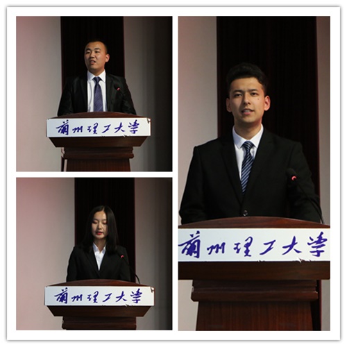 2019级丁浩同学代表研究生发言,他说:“作为兰州理工大学的新生学子,我们更应以“工大梦”托起“中国梦”,在新的起点上,不忘初心,迎接更多机遇与挑战。”2019级唐婷婷同学代表本科新生发言,她说:“在美丽的兰州理工大学,让我们一起锤炼品行,实践求知,让勤学成为青春之力,让德行成为向上之源,让明辨成为决断之要,让笃实成为做事之基!”。2018级安全工程1班的依布拉音木·阿不都热依木代表在校生发言,他说,没有目标就没有方向,我们一定要树立正确的目标,积极乐观、健康向上,时刻提醒自己追逐梦想的脚步,要传承理工大“艰苦奋斗、自强不息、求真务实、开拓创新”的红柳精神,刻苦钻研,努力拼搏。要从大一做起,从即日做起。
