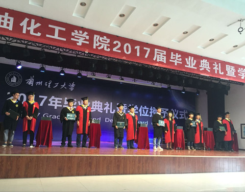 毕业典礼在庄严的国歌声中拉开序幕。隽惠玲书记宣读了《关于表彰兰州理工大学2017届优秀毕业生的决定》、梁瑞副院长宣读了《关于表彰石油化工学院2017届毕业生就业先进班级的决定》、梁卫东副院长宣读了《关于表彰石油化工学院2017届毕业生考研奖励的决定》、张伟政副院长宣读了《关于聘任2017届毕业生班级校友联络员的决定》。学位授予仪式上,学院学术委员会副主任杨保平教授宣读了《关于2017年春季学期授予丁玉鹏等444人普通本科学士学位的决定》。与会领导为获奖个人、班级、校友联络员分别颁发了证书。