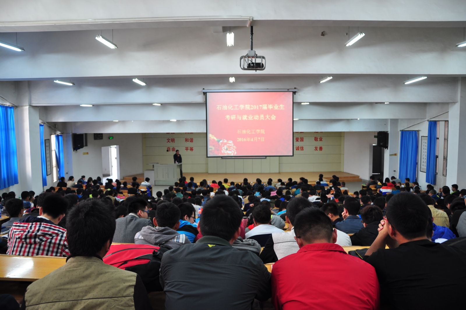 为提高学院2017届毕业生对就业形势的认识,尽早的树立正确的考研观、就业观和择业观,增强学生的竞争力,4月7日中午13:00,石化学院在西教2号楼108教室召开2017届毕业生考研与就业动员大会,学院梁瑞副院长、党委李荣华副书记、年级辅导员及2017届全体同学总计450余人参加了大会。会议由骆焕涛老师主持。