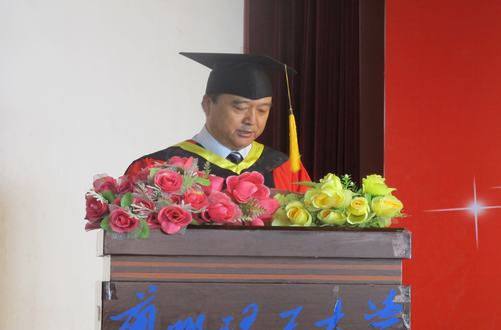 在热烈的掌声中,李贵富书记发表了热情洋溢的讲话,代表学校向各位毕业生致以最热烈的祝贺和衷心的祝愿,他对毕业生深情的说;“同学们,你们即将离开母校,奏响新的生活乐章。有句古语,“路漫漫其修远兮,吾将上下而求索”,未来探索求知的道路布满荆棘,也充满阳光。在你们即将走入社会这个大舞台之际,我作为大家的师长,也作为大家的朋友,告诫同学们四句话,与同学们共勉:第一,要爱岗敬业,做一个脚踏实地有追求的人;既要仰望星空,又要脚踏实地,勤奋努力,实现自己的人生价值。第二,要不断学习,做一个善于思考有品位的人;要活到老、学到老,不断的充实自己,提高自己,发展自己;第三,要胸怀责任,做一个懂得感恩有探索的人;愿感恩的心改变你们的态度,愿诚恳的态度改变你们的习惯,愿良好的习惯升华你们的性格,愿健康的性格收获你们美丽的人生!第四,要饮水思源,做一个爱校荣校实现梦想的人;祝愿毕业生在人生新的征途中,准确定位,抓住机遇,在新的岗位上创造出自己的辉煌业绩,你们的梦想的实现,正是献给母校最美好的礼物。