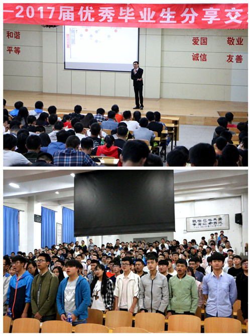 石化学院17届优秀毕业生郭飞就“如何规划大学生活” 、“学习方法探究”、“专业学习与素质拓展”等问题跟同学们进行了分享。他讲到:“每一位同学一定要从大一时期就明确目标,知道自己为什么上大学,上大学应该该做些什么,希望大学能给自己带来些什么,不能浑浑噩噩,虚度年华。”材料学院李波同学围绕“考研经验谈”、“就业方向把握”、“大学生职业生涯规划”、“自立自强”、“科创大赛经验”等问题与同学们进行了分享。他讲到:“人可以迷茫一时,但不能迷茫最关键的四年青春,把握时间,有思想、有目标,勇敢而激情地沉淀自我,绽放自我,努力拼搏,每个人都可以收获自己的精彩。” 其他几位优秀学生代表分别与同学们分享了自己的成长体会和感悟、经验与教训,话语或朴实、或严肃、或诙谐,体现了青年大学生对自身成长成才的不懈追求与深刻思考,他们以真实而鲜活的事例提醒同学们要珍惜宝贵的大学时光,并为学弟学妹鼓劲加油。