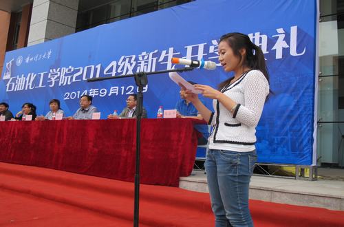 最后,学院党委隽惠玲书记代表学院讲话,她说:“今天我们如此隆重而热烈的欢迎你们,因为你们是理工大石化学院的小苹果,怎么爱你们都不嫌多。我也为你们的眼光和智慧点赞,你们选择了理工大,相信你们将来一定会为此而倍感骄傲。”同时,隽书记对2014级新生表达了殷切的期望,希望新生能够找到自己的目标与位置,从立德修身、立学致知、立志成才三个方面努力,在四年的学习中,要练就自己的必杀技,唯有如此,才有实力,要么第一,要么唯一。