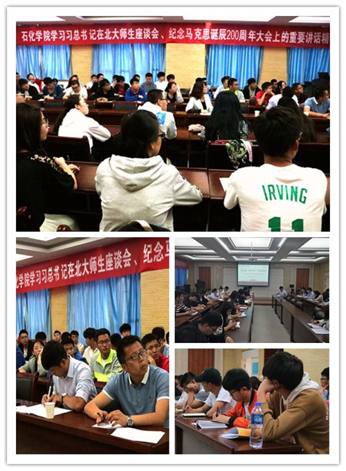 5月2日,习近平总书记赴北京大学考察并发表了重要讲话。5月4日,习近平总书记在纪念马克思诞辰200周年大会上作了重要讲话,为深入学习习近平总书记重要讲话精神,5月8日-9日,石化学院开展“院长有约”、“书记有约”、院领导班子其他成员联系班级活动,组织学生党支部、团支部分别开展学习习近平总书记北大师生座谈会、纪念马克思诞辰200周年大会上的重要讲话精神,师生共话习近平总书记提出的4点希望,在全体学生中掀起了学习热潮。