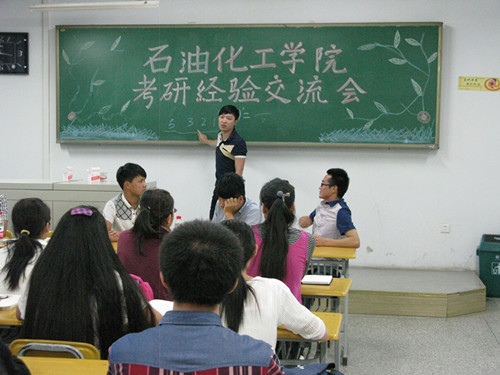 当今社会就业形势日渐严峻,大学生考研已然成为一种趋势。为帮助同学们更好地了解考研相关资讯,2015年5月24日晚19:30,石油化工学院在西校区6号楼412举办考研经验交流会。邀请了保研到北京化工大学的马天鑫同学,考取华东理工大学的鄢桂东同学以及考取本校的王威、王天龙同学和考取武汉工程大学的田一泽同学,各年级有考研意愿的同学也参加了此次交流会。