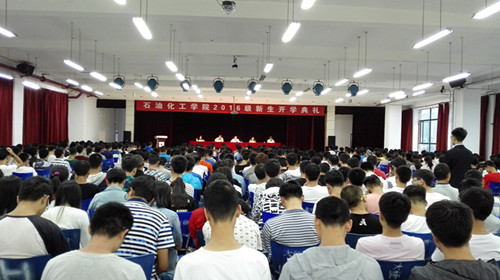 9月8日晚上19:00,石化学院2016级新生开学典礼暨“我为院庆做贡献”主题教育启动仪式在西校区大学生活动中心隆重举行。学院杨保平院长、党委隽惠玲书记、梁瑞副院长、张伟政副院长、班主任代表、各年级辅导员以及全体2016级研究生、本科新生共计600余人参加了开学典礼。典礼由党委李荣华副书记主持。