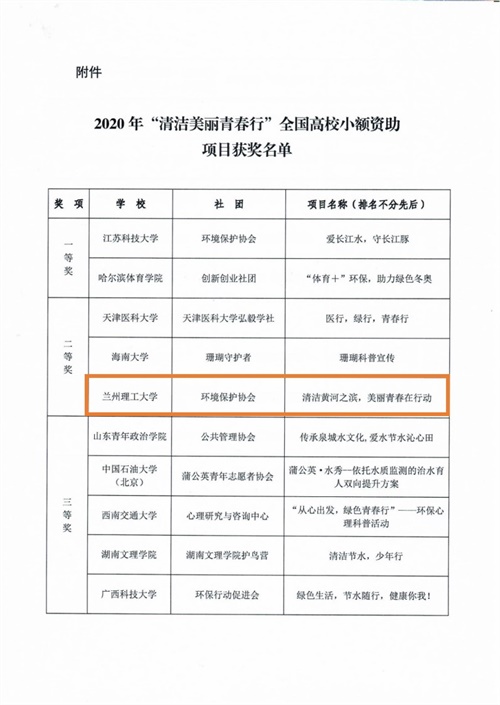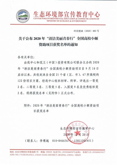 近日,生态环境部宣传教育中心2020年“清洁美丽青春行”项目获奖名单公布,我校环境保护协会荣获二等奖。