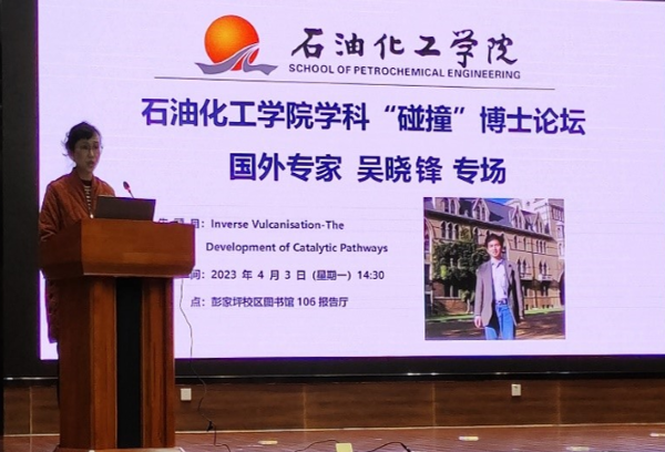 2023年4月3日,应石油化工学院邀请,利物浦大学研究员吴晓锋来校开展学术交流,并在石化学院学科“碰撞”博士论坛作题为“Inverse Vulcanisation—The Development of Catalytic Pathways”的专场学术报告。报告由石化学院副院长赵霞主持,副院长梁瑞、学校部分教师及研究生100余人听取了报告。