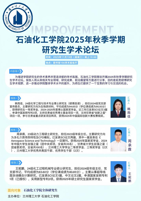 为提升学院研究生学术素养并营造浓厚的学术氛围,11月19日,第118期研究生学术论坛石油化工学院分论坛在彭家坪校区问鼎堂106报告厅顺利开展。本次论坛邀请了学院国家奖学金获得者24级博士研究生韩雨佳、23级硕士研究生周承霖、24级硕士研究生王妮鹏作报告,学院各年级研究生参加了论坛。