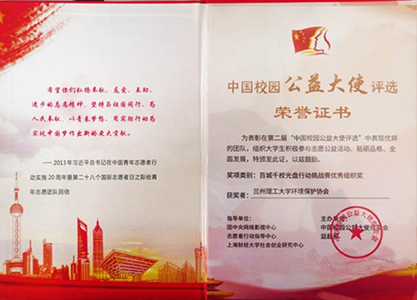 近日,兰州理工大学环境保护协会、石油化工学院龙永同学在第二届“中国校园公益大使评选”中分获“百城千校光盘行动挑战赛优秀组织奖”、“百城千校光盘行动挑战赛优秀个人奖”...